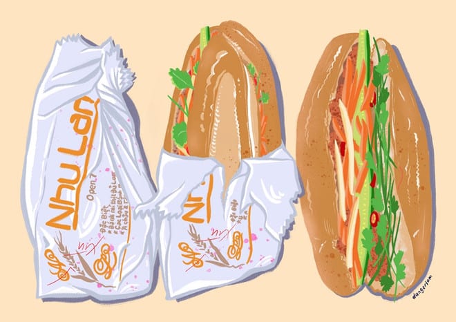 Tác giả Kim Lam chọn vẽ món bánh mì xíu mại của tiệm Như Lan ở vùng ngoại ô Footscray (Melbourne). Nói về món này, Kim Lam nghĩ ngay đến “cái gật đầu hạnh phúc” khi ăn.