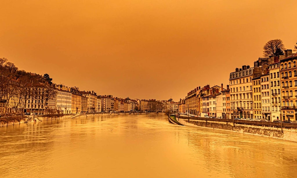 Ngày 6/2, bầu trời khu vực Trung Âu và vùng Alpes bỗng chuyển màu cam do bụi từ sa mạc Sahara. Quang cảnh từ bờ sông Saone cho thấy bầu trời màu vàng cam trên thành phố Lyon, Pháp. Ảnh: Shutterstock.