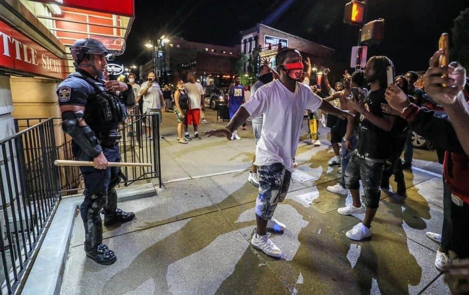 1.Sau 3 đêm tuần hành ở Kentucky, những người biểu tình đã đi bộ, hô vang và quỳ xuống cầu nguyện cùng với cảnh sát thành phố Lexington. Một người biểu tình bước tới hàng cảnh sát bắt tay từng người một.