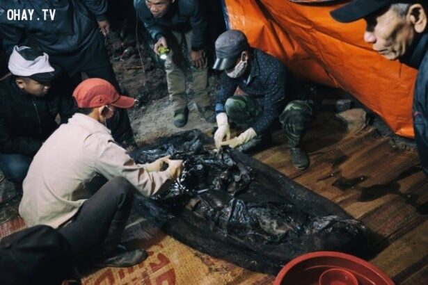 Người thân, cùng những người chuyên hành nghề bốc mộ, chung sức đưa cỗ quan tài bằng gỗ lên mặt đất. Tất cả nín thở chờ đợi cho đến khi chiếc nắp quan tài bật ra và thấy xác đã phân hủy, chỉ còn lại xương. Không ai muốn dùng dụng cụ để lóc thịt của người thân đã khuất.
