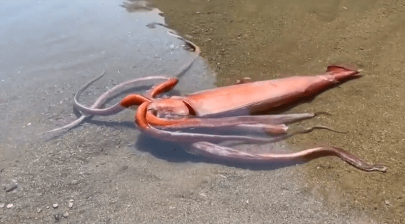 Con mực với kích thước khổng lồ dạt vào bãi biển, thu hút sự chú ý của người dân địa phương và du khách.
