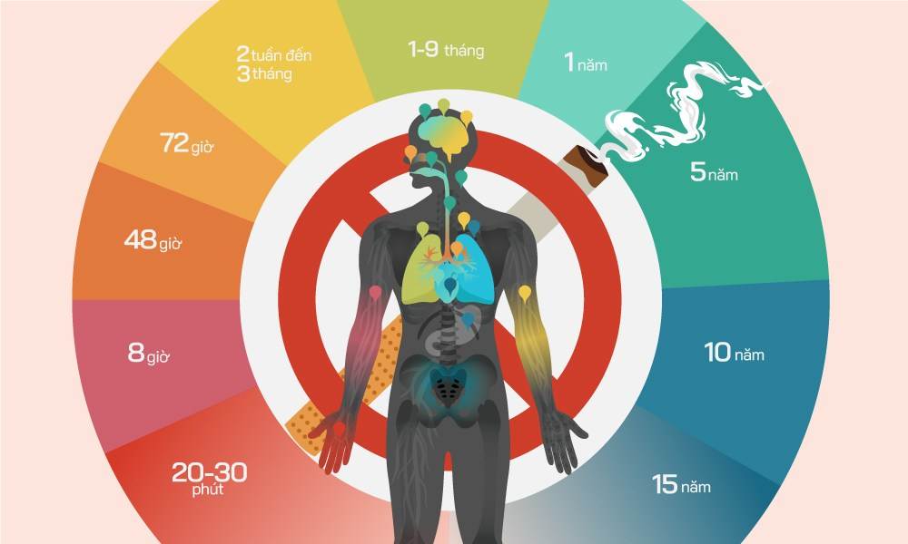 Ngừng hút thuốc lá trong hai tuần đến 3 tháng giúp phổi và hệ tuần hoàn cải thiện rõ rệt; 1-5 năm giảm nguy cơ bệnh tim mạch, đột quỵ.