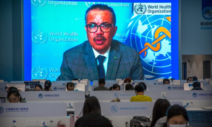 Tổng giám đốc WHO Tedros Adhanom Ghebreyesus trong bài phát biểu được ghi hình sẵn gửi tới Hội chợ Nhập khẩu Quốc tế Trung Quốc tại Thượng Hải ngày 4/11/2020. Ảnh: AP.