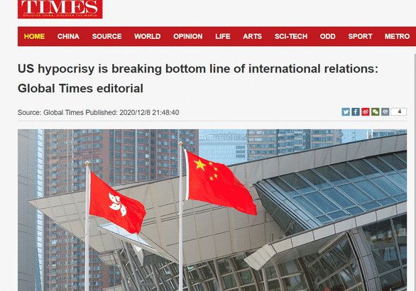 Thời báo Hoàn Cầu cho rằng Mỹ sẽ tự làm hại chính mình. “Mỹ cần tính toán thiệt hại của họ trước. Hong Kong đóng góp hàng chục tỷ USD thặng dư thương mại cho Mỹ mỗi năm và thành phố liên hệ gần gũi với lợi ích của rất nhiều công ty lớn của Mỹ”, bài xã luận viết.