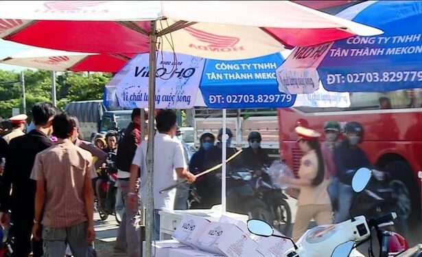 Trong khi các nữ cảnh sát giao thông Vĩnh Long đang phát nước suối cho người dân đi đường bị kẹt xe, chủ nhà bực tức mang gậy ra đập phá, hất đổ các thùng nước do mất mối buôn bán.