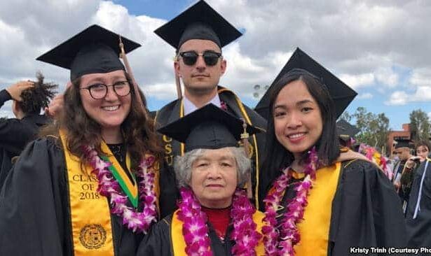 Cụ bà 75 tuổi nói tiếp: “Cô muốn nói rằng điều kiện ở Mỹ rất là tốt, hơn ở Việt Nam. Ở Việt Nam không khuyến khích người già đi học, nhất là trường đại học. Ở Mỹ nhà trường không có hỏi hay đặt điều kiện để hạn chế người già. Chính phủ vẫn coi mọi công dân như nhau, mọi sinh viên như nhau”.