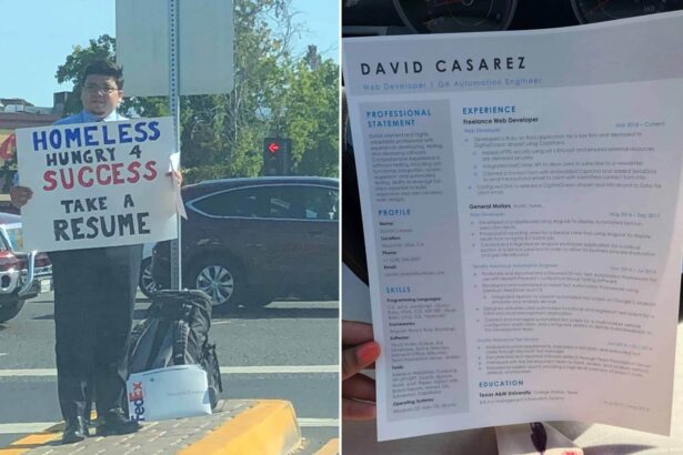 Cách đây gần một tháng, Casarez, 26 tuổi, được nhìn thấy đứng trên một con phố tại Mountain View, bang California, nơi có trụ sở của nhiều ông lớn về công nghệ như Google, với tấm bảng viết: “Không nhà cửa. Muốn thành công. Hãy lấy một bản hồ sơ”.