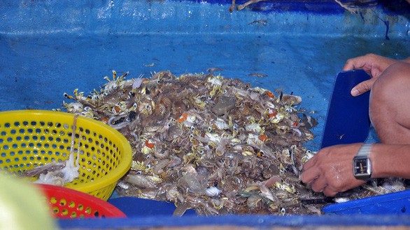 Thành quả của một mẻ lưới giã cào, chủ yếu là hải sản nhỏ – Ảnh: ĐÔNG HÀ