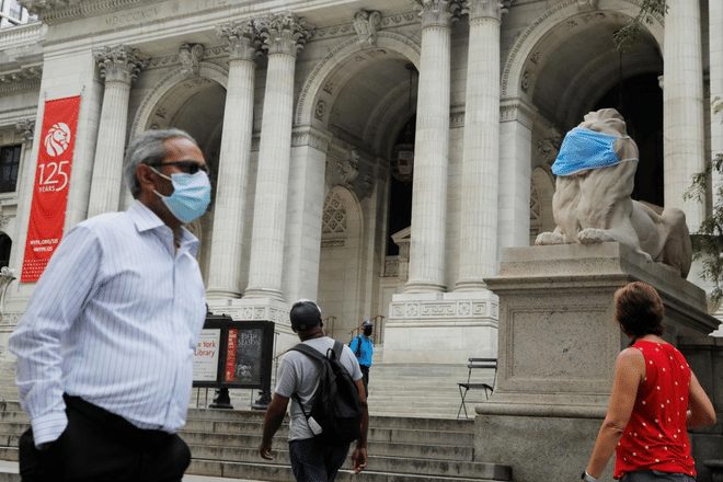 Bức tượng sư tử đá trước cửa Thư viện Công cộng New York ở quận Manhattan của New York được đeo chiếc khẩu trang lớn. Ảnh: Reuters. |