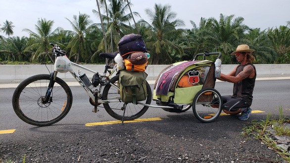 Anh Lê Hoàng- người đạp xe đồng hành khi anh Việt chạy bộ từ HN- Singapore- Ảnh: NVCC