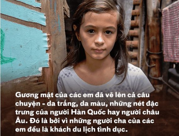 Bạn có thể bắt gặp những câu chuyện như vậy ở khắp các khu ổ chuột tại thành phố Angeles, Philippines – những đứa trẻ sinh ra từ du lịch tình dục. Gương mặt của các em đã vẽ lên cả câu chuyện – da trắng, da màu, những nét đặc trưng của người Hàn Quốc hay người châu Âu.