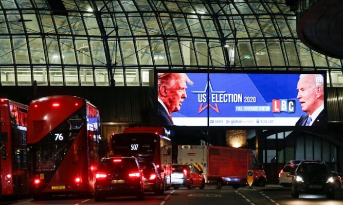Màn hình quảng cáo ở London, Anh đưa tin về bầu cử Mỹ. Ảnh: AP.