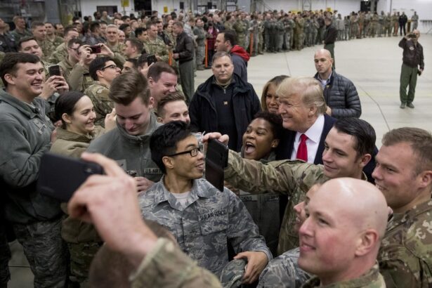 Tổng thống Trump cùng binh lính Mỹ tại căn cứ không quân Ramstein, Đức, năm 2018. Ảnh: AP. |