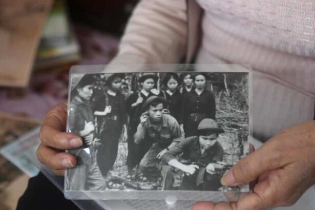 Bà Hoàng Thị Nở, cho AFP xem ảnh thời kỳ bà trong tiểu đội « 11 cô gái Sông Hương ».