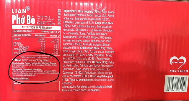 Ngoài ra, sản phẩm được phân phối bởi một công ty nước ngoài có tên “Tasman Foods International”. Trên bao bì còn in rõ cụm từ “Product of Vietnam” (tức một sản phẩm của Việt Nam).