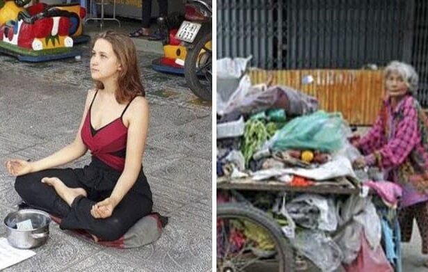 Một chị đang ăn xin kết hợp tập thiền?! Không xa lắm là bà cụ bán ve chai để kiếm sống hàng ngày… (Ảnh: TonsTweetings)