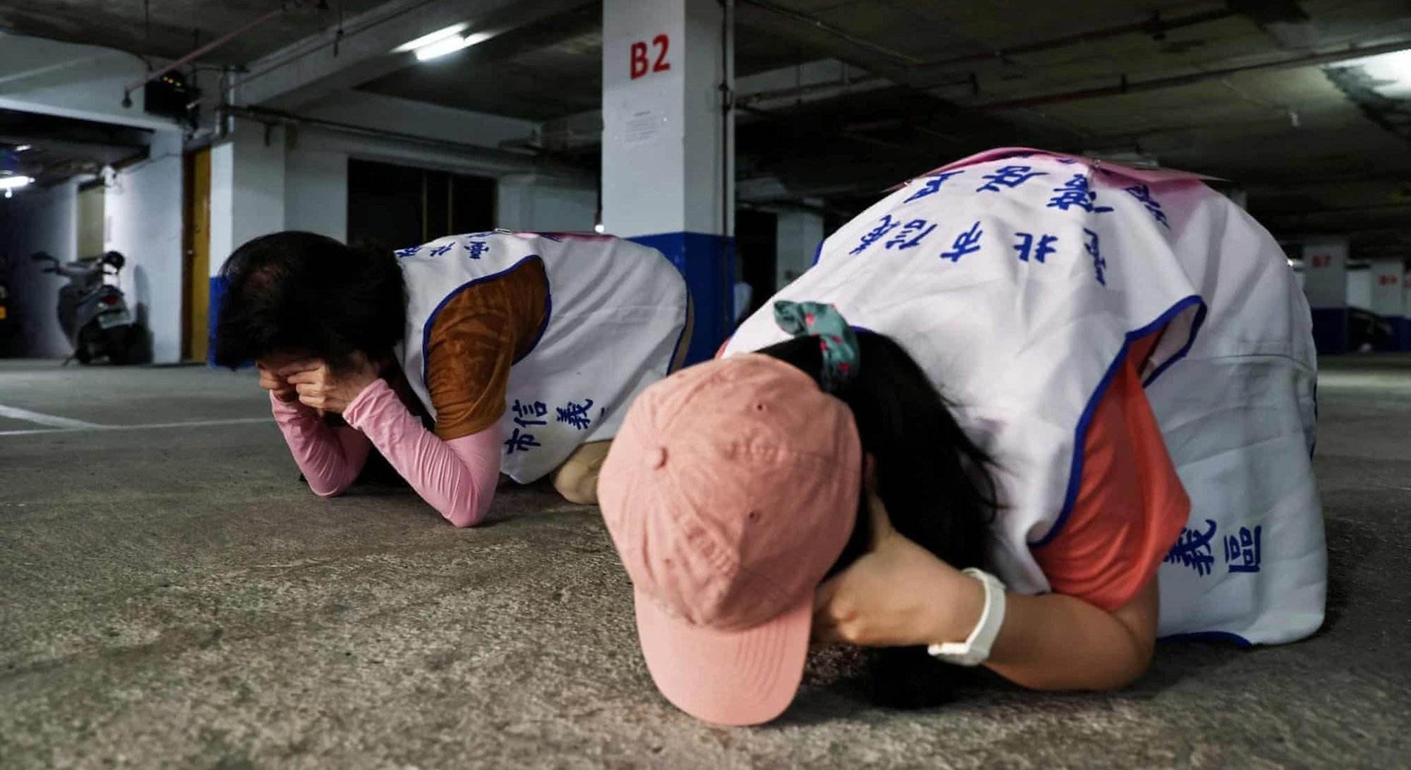 Người dân Đài Loan tập cách che mắt và tai trong khi há miệng để giảm tác động của sóng âm gây ra từ những vụ nổ. Ảnh: Reuters.