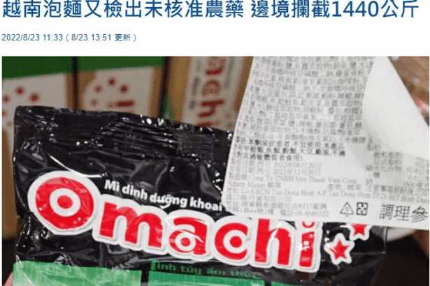 Hôm 23-8, Hãng tin CNA (Đài Loan) đưa tin Cục Quản lý thực phẩm và dược phẩm thuộc Cơ quan Y tế và phúc lợi Đài Loan phát hiện mì ăn liền Omachi có chất cấm ethylene oxide xuất xứ từ Việt Nam. Cụ thể, lô mì ăn liền hương vị tôm chua cay Omachi nhập khẩu từ Việt Nam có chất bảo vệ thực vật ethylene oxide chưa được cấp phép sử dụng tại vùng lãnh thổ này.