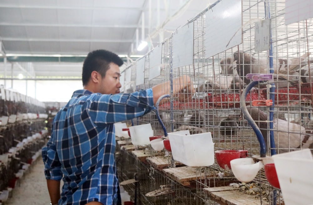 | Anh Đoàn Quang Tùng kiểm tra chuồng trại nuôi chim bồ câu Pháp. |