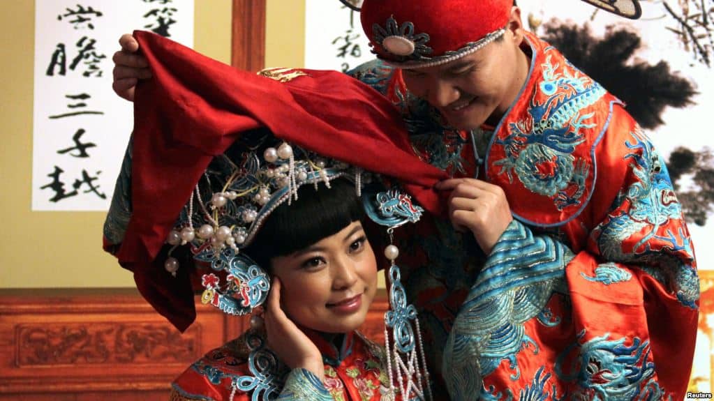 Một cặp đôi đính hôn trong trang phục cưới truyền thống của Trung Quốc chụp ảnh cưới ở một studio ở trung tâm Bắc Kinh. Đàn ông ở nông thôn Trung Quốc ngày càng có ít cơ hội lấy được vợ vì ‘giá cô dâu’ tăng cao.