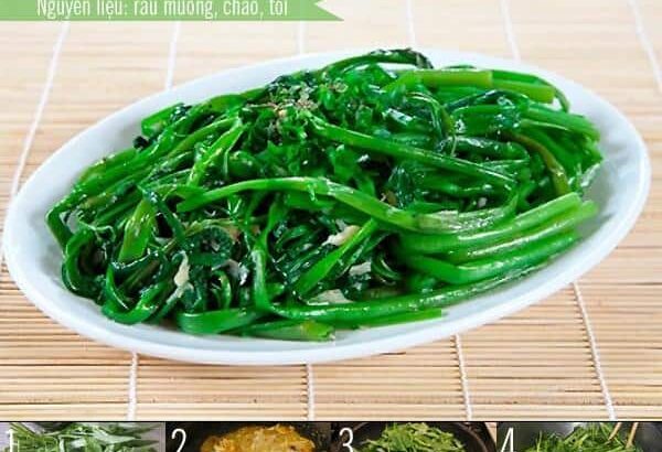 Rau muống đem nhặt lấy ngọn non, có thể cắt khúc nếu rau quá dài. Rửa sạch vài lần với nước rồi để ráo nước.