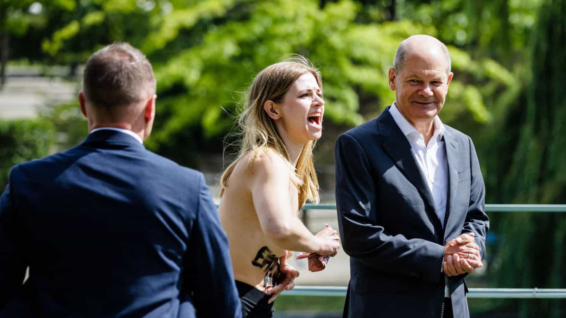 Khi ông Olaf Scholz có mặt ở vườn để chụp ảnh với khách tới thăm Văn phòng Thủ tướng, có hai phụ nữ bất ngờ lao về phía Thủ tướng Đức, đứng cạnh ông và lột áo, kêu gọi Đức cấm nhập khẩu khí đốt Nga trong bối cảnh Moscow đang thực hiện chiến dịch quân sự nhằm vào Ukraine.