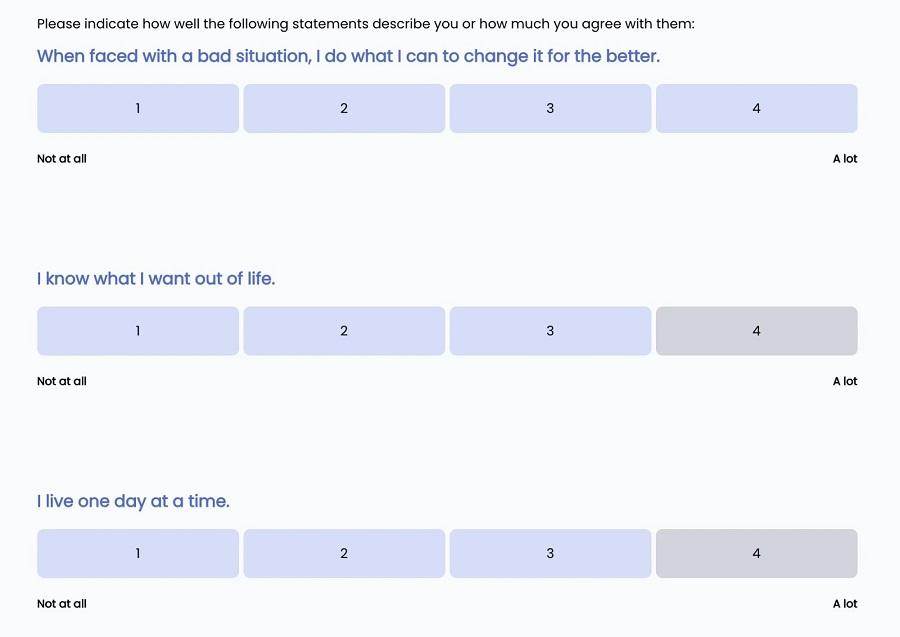 Ứng dụng yêu cầu bạn đánh giá bản thân trên thang điểm về các chủ đề: “Tôi biết mình muốn gì trong cuộc sống”, “Tôi có thể dựa vào bạn bè để được giúp đỡ đến mức nào nếu gặp vấn đề nghiêm trọng?”, “Tôi thích hầu hết các tính cách của mình”, “Xã hội không thay đổi cho những người như tôi” và “Tôi có thể làm bất cứ điều gì mình quyết định”.