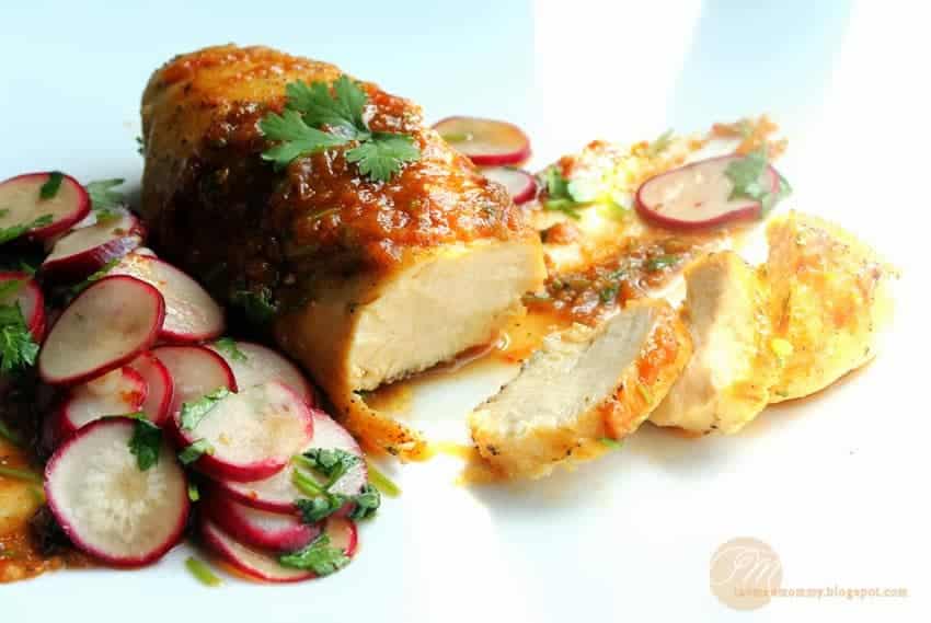 Cách làm: Trộn đều các hỗn hợp lại ướp gà, sau đó ướp ít nhất khoảng 30’. Sau đó, cho dầu ăn vào chảo, đợi dầu nóng cho gà vào làm cháy cạnh. Mỗi mặt miếng thịt gà đun khoảng 1 – 2’. Cho chảo thịt gà nướng ở nhiệt độ 400 F – 200 C thêm 8 phút nữa tuỳ theo miếng thịt gà nhà mình để kiểm tra.