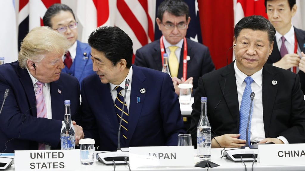| Từ trái qua: Tổng thống Mỹ Donald Trump, Thủ tướng Nhật Shinzo Abe và Chủ tịch Trung Quốc Tập Cận Bình. Ảnh: Kyodo. |