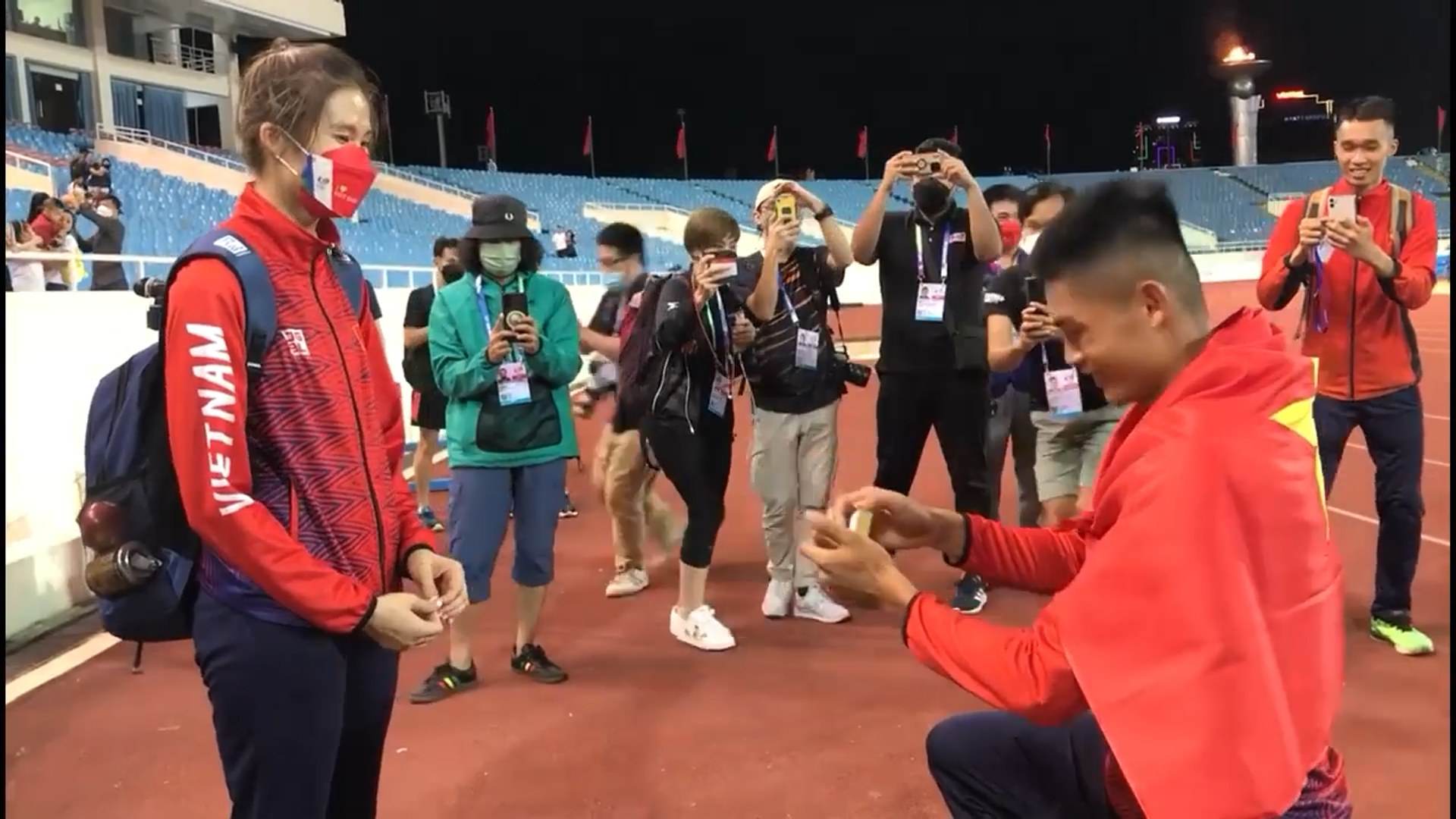 Sự kiện diễn ra tối 15/5, trên sân Mỹ Đình. Ngay sau khi bước xuống từ bục nhận HCV nội dung nhảy xa nam, tại SEA Games 31, Nguyễn Tiến Trọng tiến đến quỳ xuống cầu hôn bạn gái Nguyễn Thị Phương Trinh.