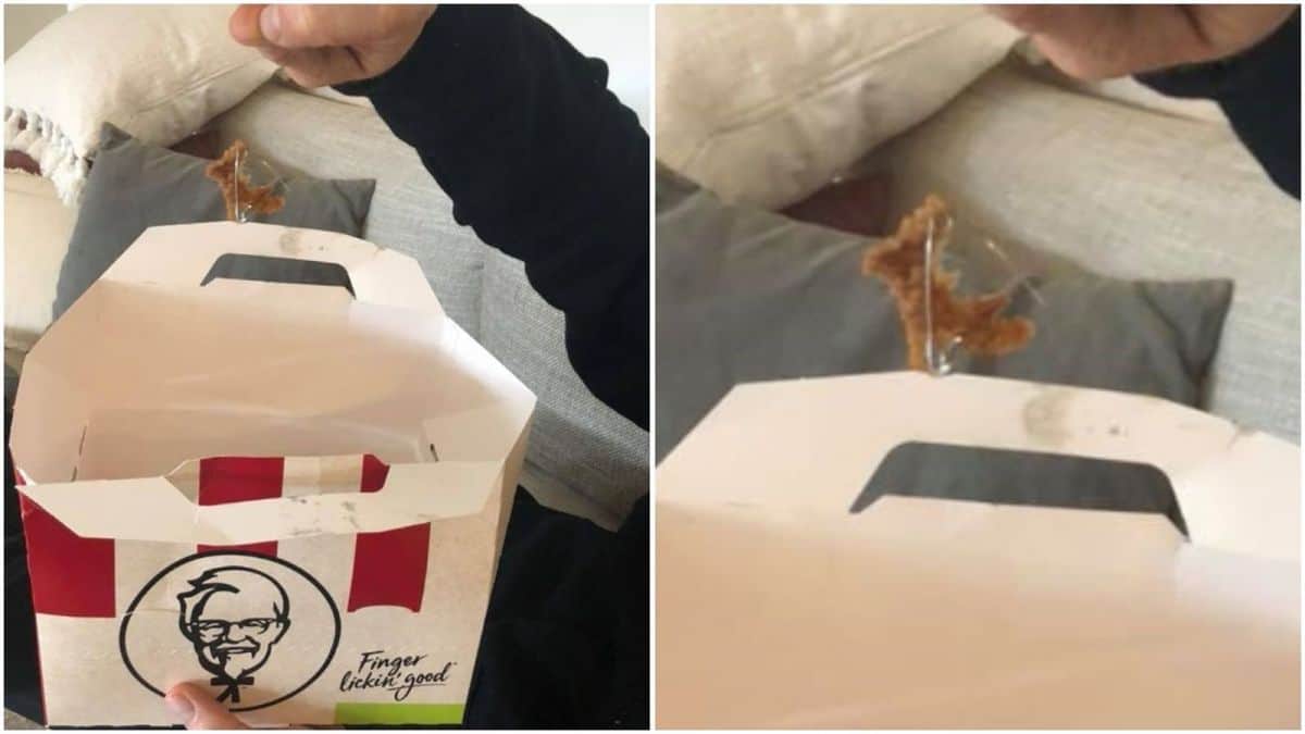 Anh Allen giải thích rằng, anh đã mua một phần ăn Zinger tại một cửa hàng KFC ở vùng Cranbourne, và anh đã bị sốc với những gì mà anh nhìn thấy. Một bức ảnh do anh Allen đăng tải cho thấy một miếng thịt gà, bị xiên qua bởi một cây ghim băng, đang treo lủng lẳng trên một sợi tóc.