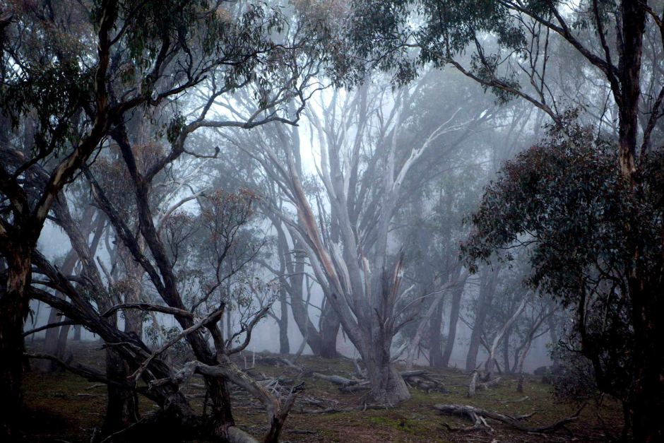 Sương mù phủ quanh những khu rừng tại Canberra vào sáng mùa Đông lạnh giá. (ABC News: Jenny Magee )