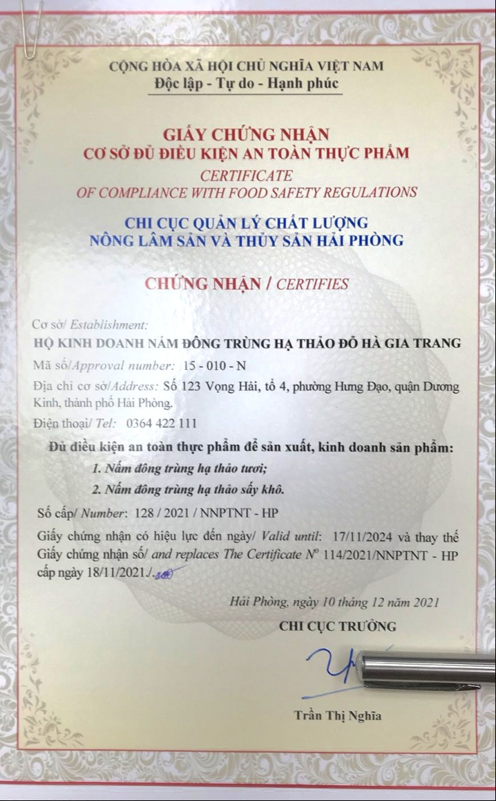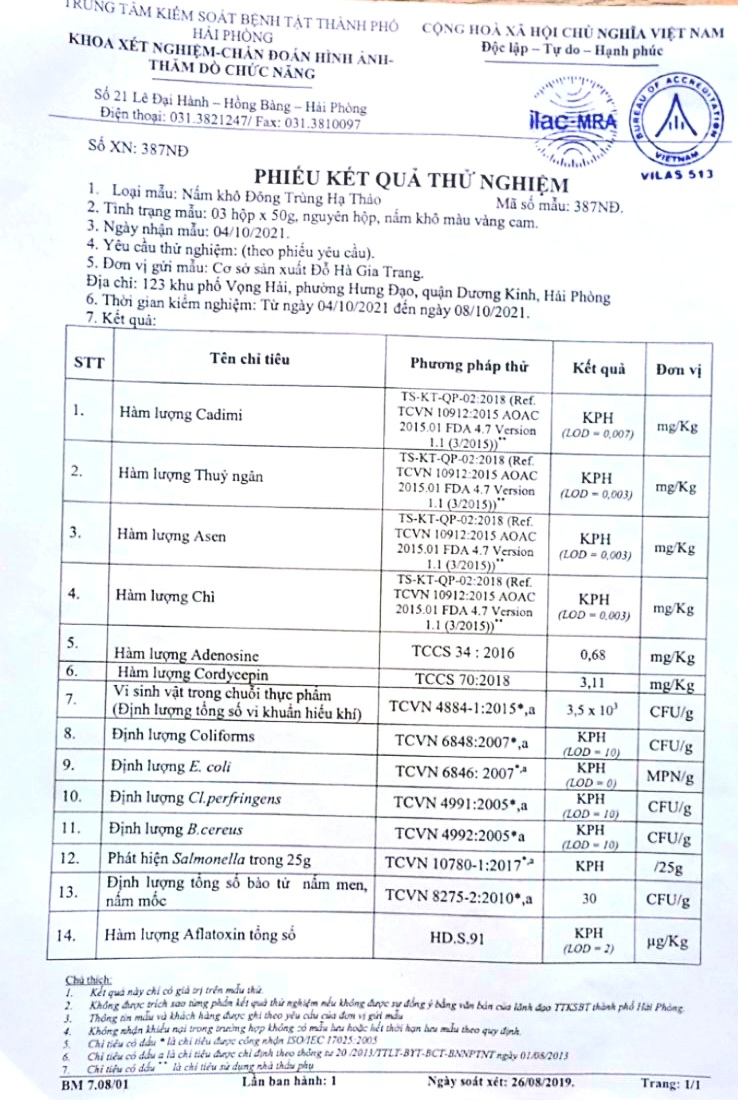 Đông trùng được nuôi cấy theo công nghệ hiện đại, sau mỗi 1 đợt thu hoạch đều được mang đi kiểm nghiệm tại Viện kiểm nghiệm an toàn vệ sinh thực phẩm Quốc gia nên về chất lượng là cực kỳ đảm bảo