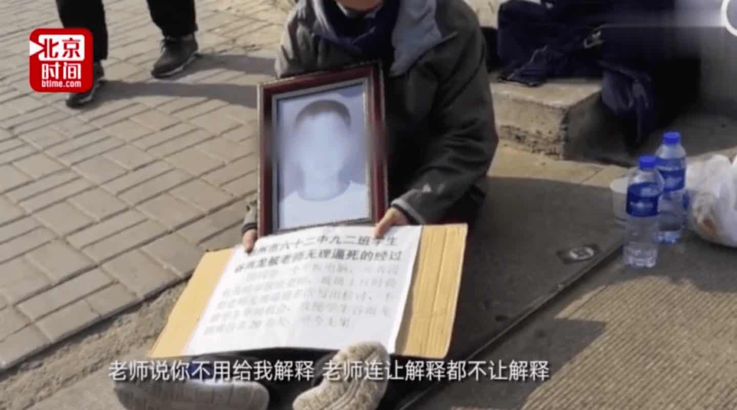 Theo đoạn video được chia sẻ trên MXH Trung Quốc gần đây, một cặp vợ chồng ôm bức ảnh chân dung cùng tấm bảng kể lại về cái chết đau đớn của một cậu thiếu niên. Được biết, video được quay vào ngày 1/4 tại lối vào của trường trung học 62 ở thành phố Trịnh Châu, tỉnh Hà Nam.
