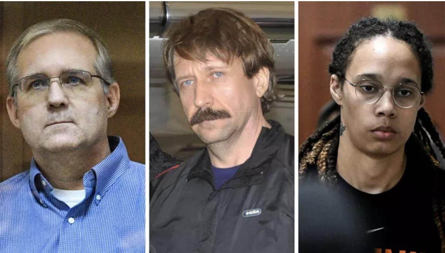 (Từ trái qua phải) Paul Whelan, Viktor Bout và Brittney Griner. Ảnh: CBS.