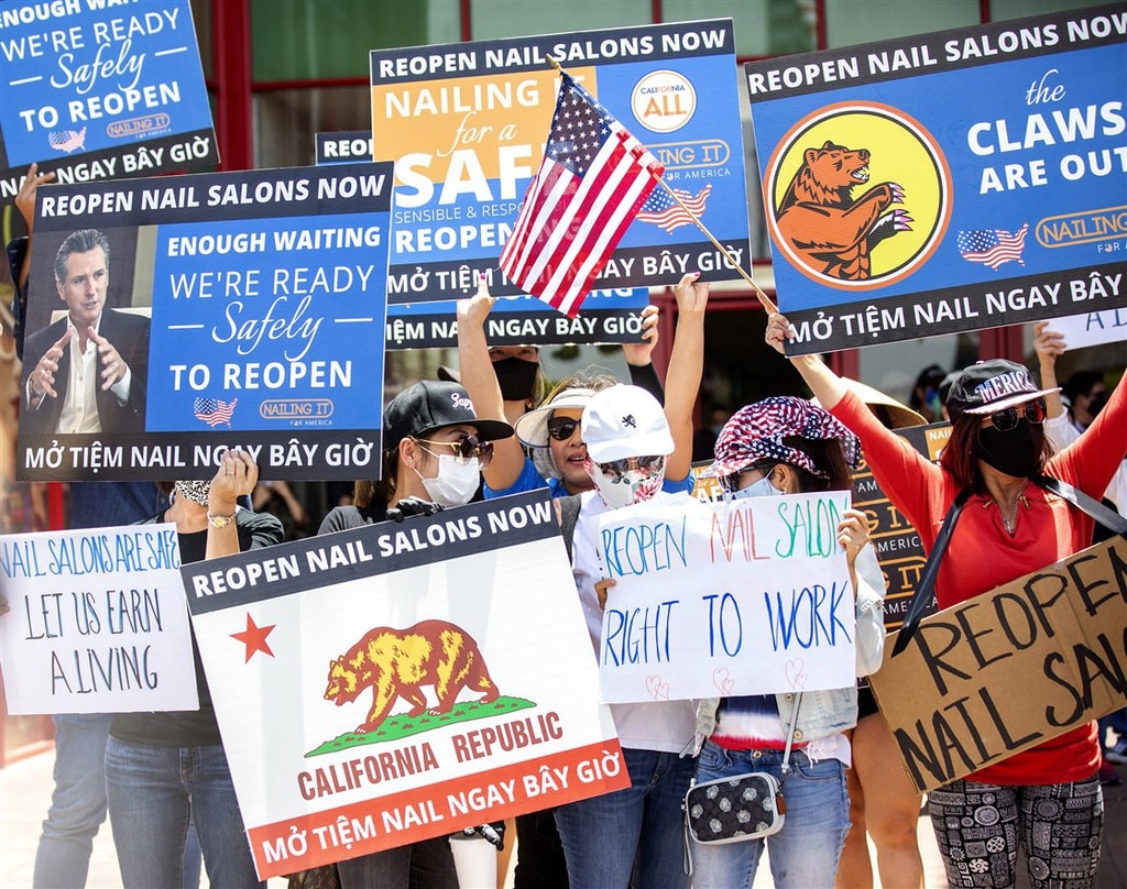Từ ngày 19/6, bang California đã cho phép các cơ sở kinh doanh dịch vụ làm đẹp và chăm sóc sức khỏe được mở cửa trở lại. Song một số hạt ở vùng vịnh, bao gồm hạt Santa Clara, tiếp tục áp lệnh phong tỏa hoặc lệnh giám sát đối với các tiệm làm móng đến cuối tháng 7.