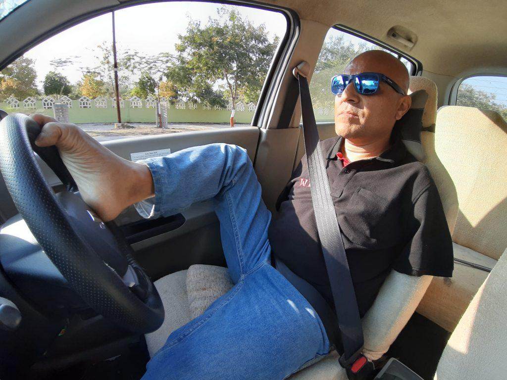 Vikram Agnihotri dễ dàng điều khiển ô tô chỉ bằng 2 chân (Ảnh: Local Samosa).