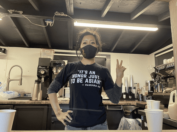 Chị Jackie Nguyễn với chiếc áo thể hiện sự tự hào vì nguồn gốc châu Á trong ngày mở lại quán cà phê – Ảnh: TWITTER