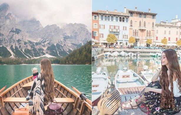 Ảnh trái là hình ảnh Sarah chụp trên hồ Lago di Braies, ảnh phải là chụp cạnh hồ Garda, Italy.