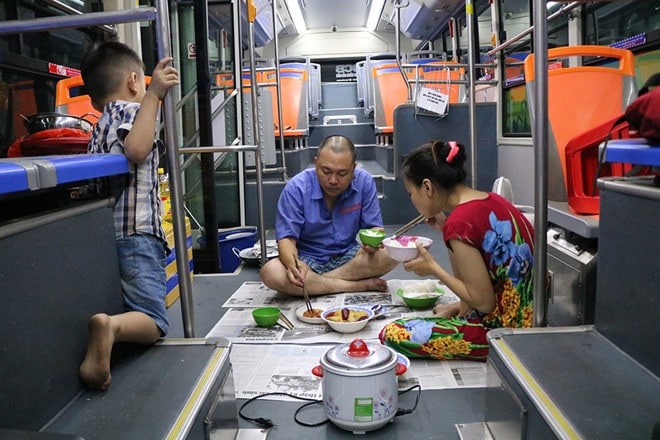 Cũng như những gia đình khác, sau một ngày làm việc mệt mỏi, anh Phương và chị Loan sẽ ăn bữa cơm gia đình, chăm sóc con nhỏ rồi đi ngủ. Nhưng thay vì sinh hoạt trong một ngôi nhà ấm cúng thì lại trên… chiếc xe buýt.