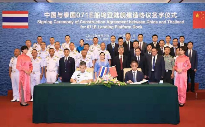Đô đốc Luechai Ruddit (ngồi, trái) đại diện Thái Lan ký mua tàu đổ bộ Type-071. Ảnh: China Daily