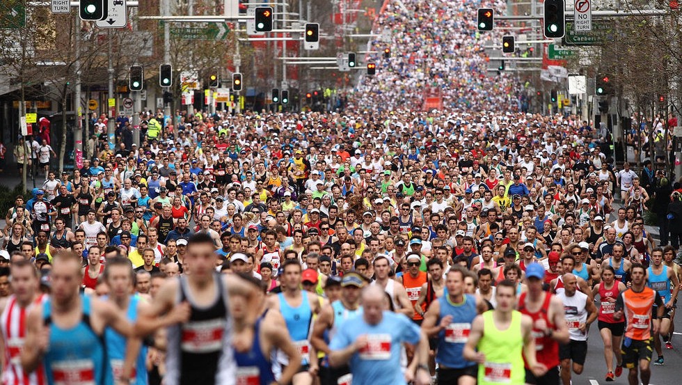 Vận động viên chạy marathon và các vận động viên xe lăn chuyên nghiệp là những người đầu tiên xuất phát và buổi sáng ngày chủ nhật đầy nắng, tiếp theo là những tín đồ, ưa thích ăn mặc những trang phục vui nhộn và cả người già.