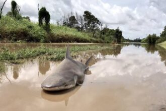 Úc: Giật mình thấy cá mập bò nằm chềnh ềnh giữa đường sau bão ở Queensland