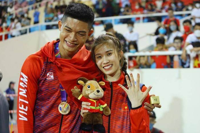 VĐV giành HCV nội dung nhảy xa nam Nguyễn Tiến Trọng (điền kinh) có màn cầu hôn bạn gái Nguyễn Thị Phương Trinh (cầu mây nữ) ngay trên đường chạy sân vận động Mỹ Đình.