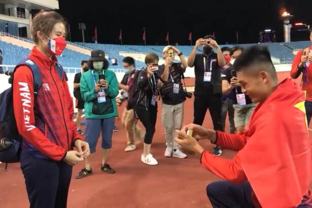 Sự kiện diễn ra tối 15/5, trên sân Mỹ Đình. Ngay sau khi bước xuống từ bục nhận HCV nội dung nhảy xa nam, tại SEA Games 31, Nguyễn Tiến Trọng tiến đến quỳ xuống cầu hôn bạn gái Nguyễn Thị Phương Trinh.