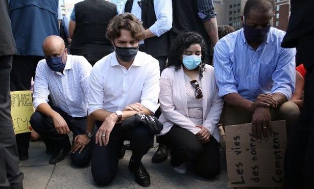 Xuất hiện với khẩu trang, trong sự bảo vệ của lực lượng an ninh và được Bộ trưởng Gia đình Ahmed Hussen, một người da đen, ông Trudeau đã quỳ gối cùng người biểu tình để tưởng nhớ George Floyd, người Mỹ da đen tử vong sau khi bị cảnh sát ghì cổ.