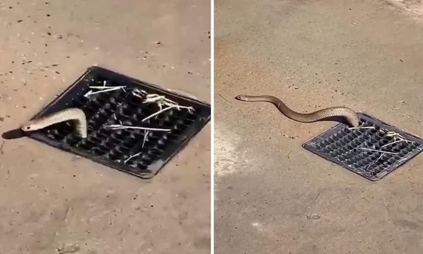 Ban đầu chỉ một phần của con rắn thò ra khỏi nắp cống, rồi sau khi bò lên trên, chúng ta có thể thấy nó phải dài hơn 2 m và di chuyển rất nhanh tới bụi rậm gần đó.