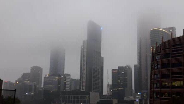 Các địa danh tại Sydney gần như đã bị sương mù phủ trắng, chỉ có nóc những tòa nhà chọc trời là có thể nhô lên khỏi màn sương.