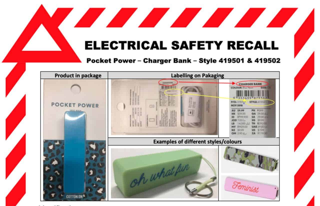 Theo tuyên bố này cho biết sản phẩm sạc dự phòng của Cotton On không tuân thủ các tiêu chuẩn an toàn và có nguy cơ gây điện giật và cháy nổ vì quá nóng.