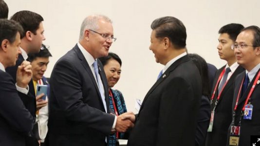 Thủ tướng Úc Scott Morrison (trái) và Chủ tịch Trung Quốc Tập Cận Bình.